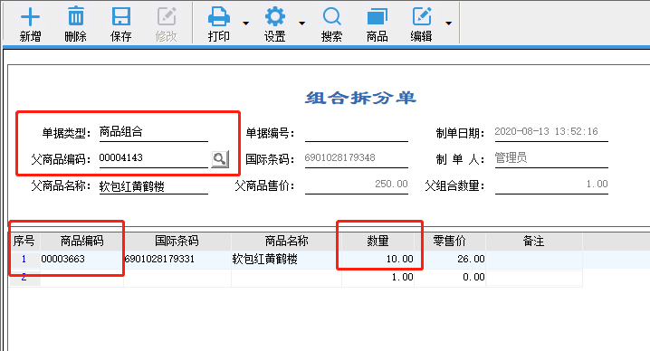 点击仓库系统-组合拆分单-点击新增-单据类型选择:商品组合-然后在父商品编码内输入大包装条码-再下方商品编码内输入小包装条码-数量内填写多少个小包装可以组成一个大包装.